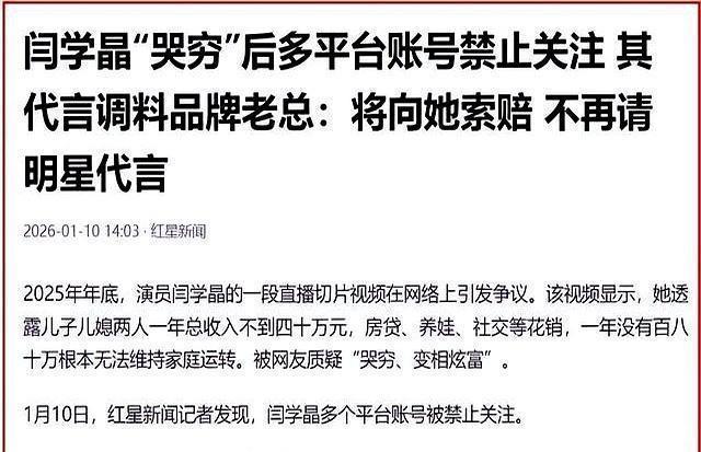 资本这鼻子,比狗还灵,它们知道,一个被负面舆论包围的代言人,那就是个“烫手山芋”,从“香饽饽”变成了“大累赘”。统厨可惨了,遭遇了退货潮,生产线都停摆了,几十万套印着闫学晶头像的旧包装直接成了废品,损失好几百万呢。品牌方气得直跳脚,律师函都在路上飞奔了,准备找她索赔。按照行业潜规则,这赔偿金可得是代言费的一到两倍呢。这还只是一个品牌,要是把其他合作方都算上,闫学晶估计得从“国家一级演员”变成“国家一级负债人”,这落差,比坐过山车还刺激。