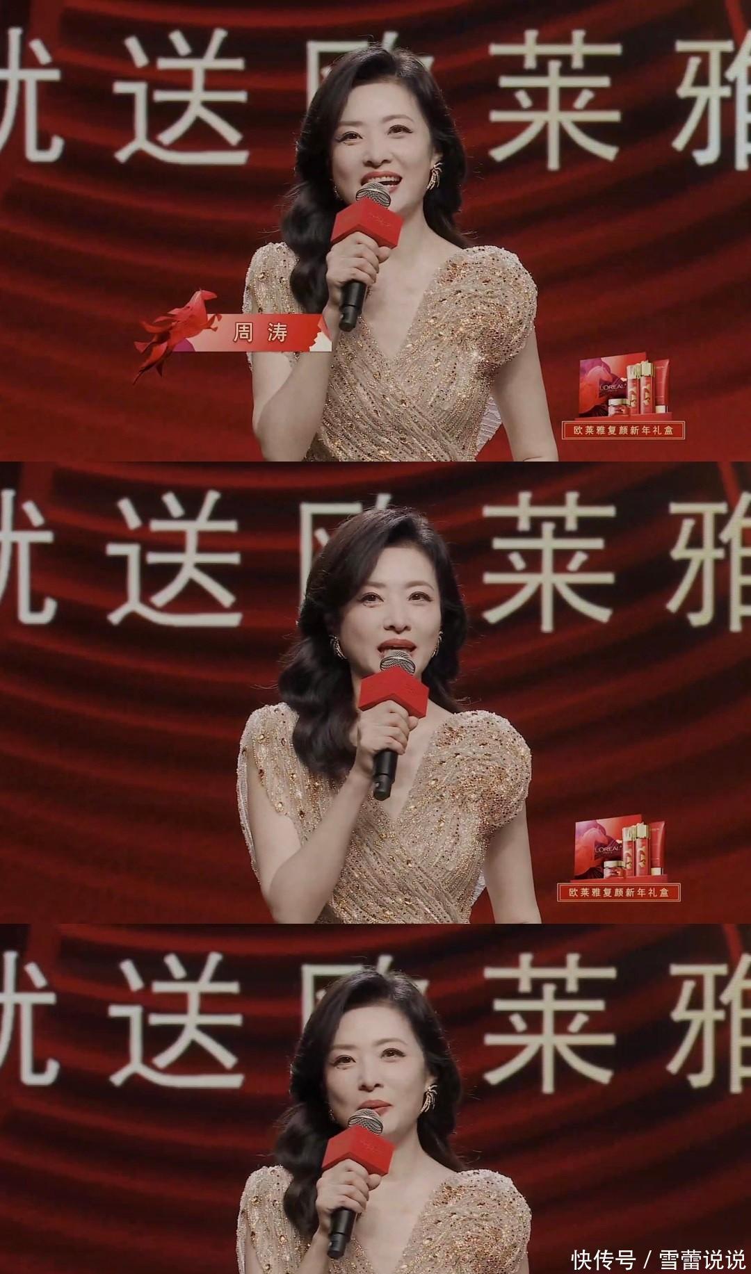 周涛一登台,那句熟悉的“大家过年好”,瞬间就把人拽回了看春晚的旧时光里。她穿着杏色亮片长裙,卷发微扬,骨相优越的小方脸哪怕带着岁月痕迹,也掩不住那份端庄大气的美。举手投足间,全是沉淀下来的优雅和自信,气场稳得一批,话筒一拿,硬是把这场商业晚会撑出了春晚的架势。