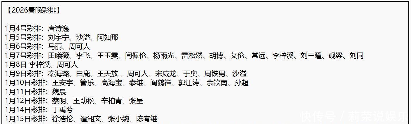 截至1月16日,有50多位艺人先后现身彩排现场,其中就包括沈腾、马丽、唐诗逸、蔡明、沙溢、白鹿、玲花、丁禹兮等人。