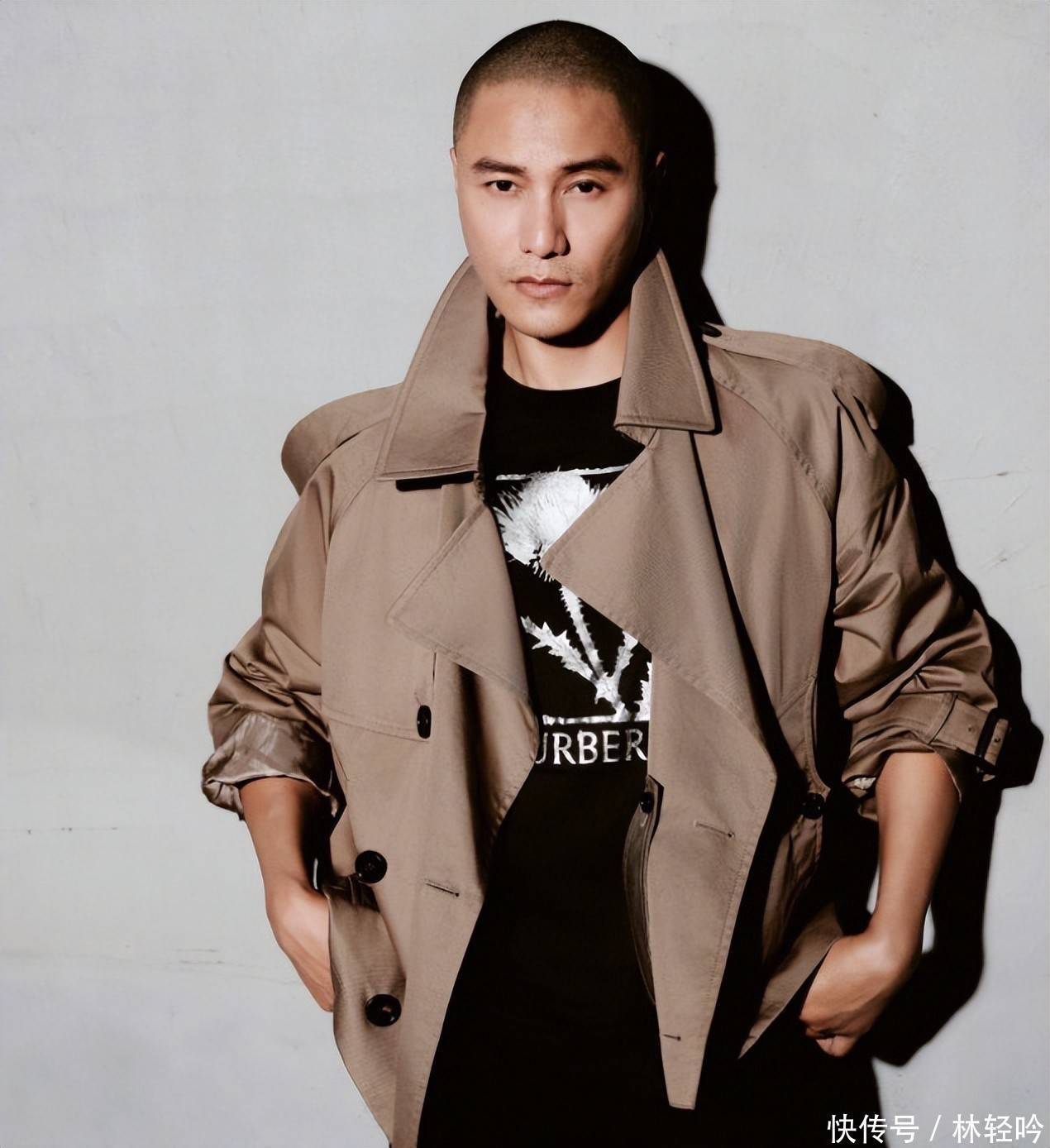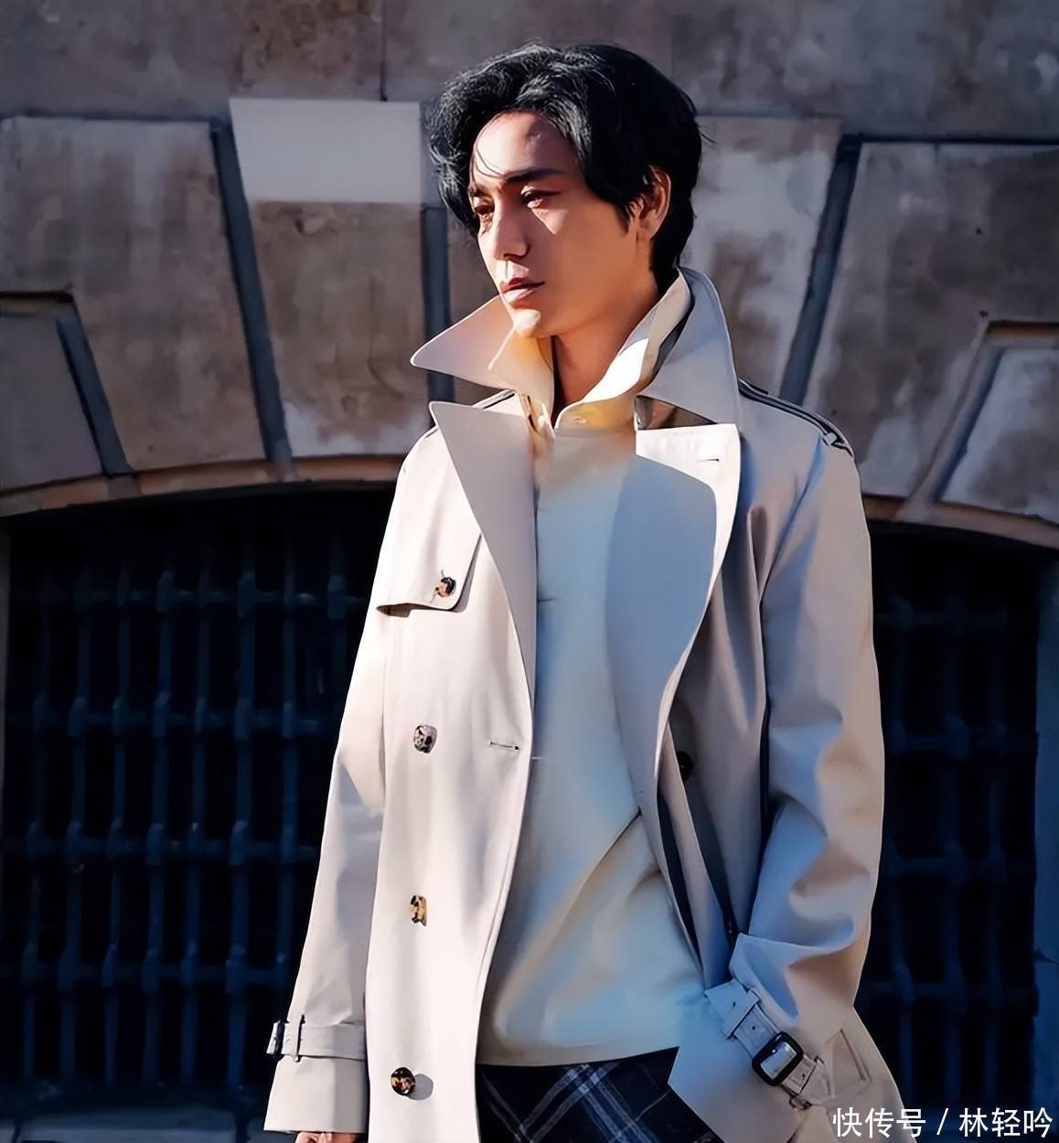照片中的他,身着驼色双排扣羊毛长风衣,内搭纯黑高领针织衫,身形挺拔,气场沉敛如松。