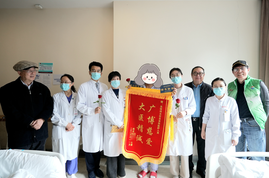 医护人员和志愿者为患者送上鲜花与贺卡,患者也为医生送上锦旗。
